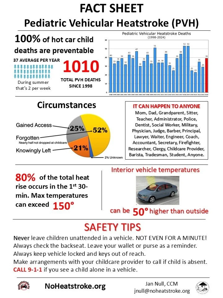 Pediatric vehicular heatstroke deaths, 2024: 39 • Total number of Pediatric Vehicular Heatstroke deaths, 2023: 29 • Pediatric Vehicular Heatstroke deaths, 1998-present: 1010 • Average number PVH deaths per year: 37 •
