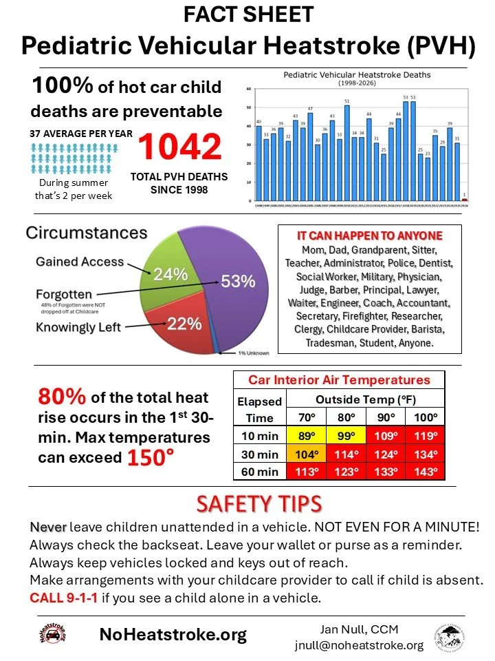 Pediatric vehicular heatstroke deaths, 2026: 1 • Total number of Pediatric Vehicular Heatstroke deaths, 2025: 31 • Pediatric Vehicular Heatstroke deaths, 1998-present: 1042• Average number PVH deaths per year: 37 •
